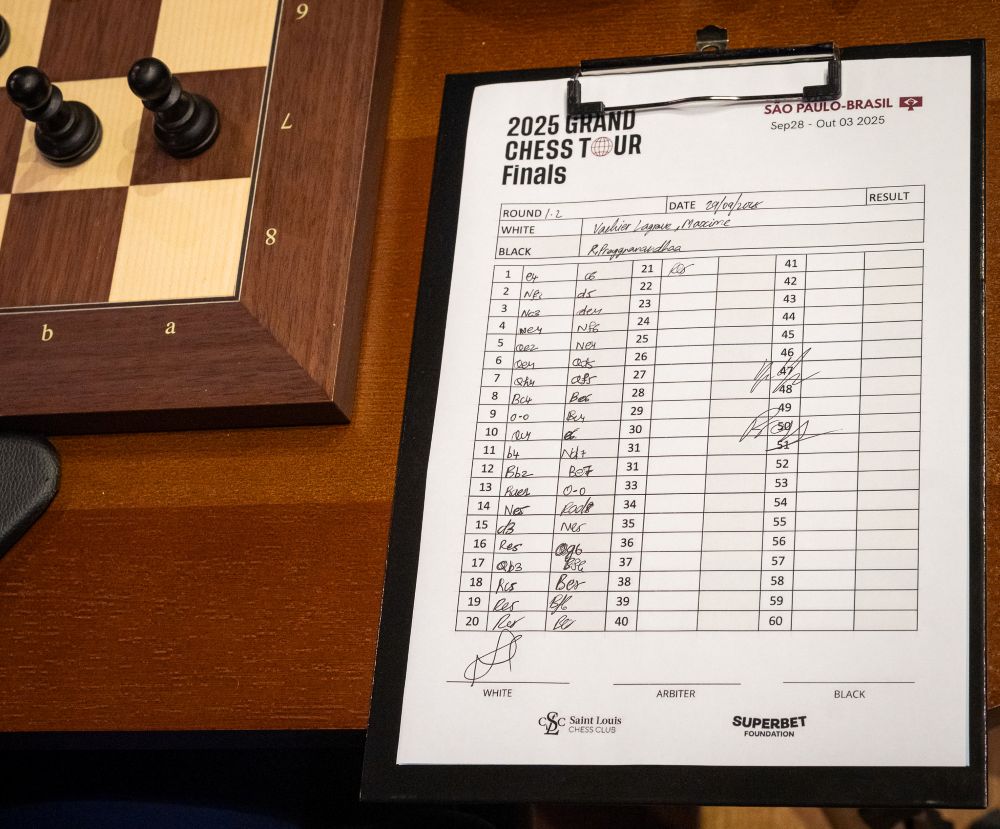 GM R Praggnanandhaa opted for the Caro-Kann with the black pieces in the second Semifinal game of Grand Chess Tour 2025 Finals. The World Blitz 2021 champion got surprised momentarily. However, the game ended in a draw in just 21 moves. The battle between Levon Aronian (USA) and Fabiano Caruana (USA) also ended in a draw. It lasted five more moves than the other game. Both games finished in under two hours. All four players have six points each. Two Rapid and four Blitz games will be played. Semifinal continues today at 3 p.m. local time, 11:30 p.m. IST. Photo: Lennart Ootes / Grand Chess Tour