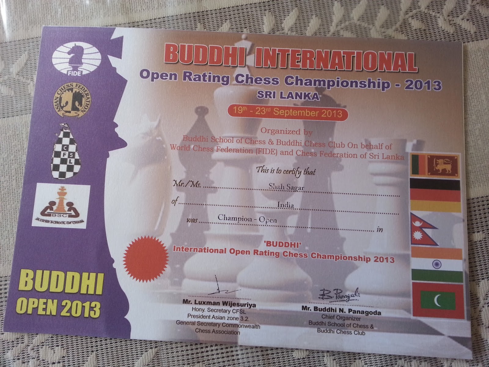 The fourth Buddhi International open chess rating tournament was held in Sri Lanka from the 19th-23rd of September 2013. I won the tournament convincingly with a score of 8.5/9. Quite a good result, but I was strongest player in the event by quite some margin and it wasn't surprising that I emerged victorious.